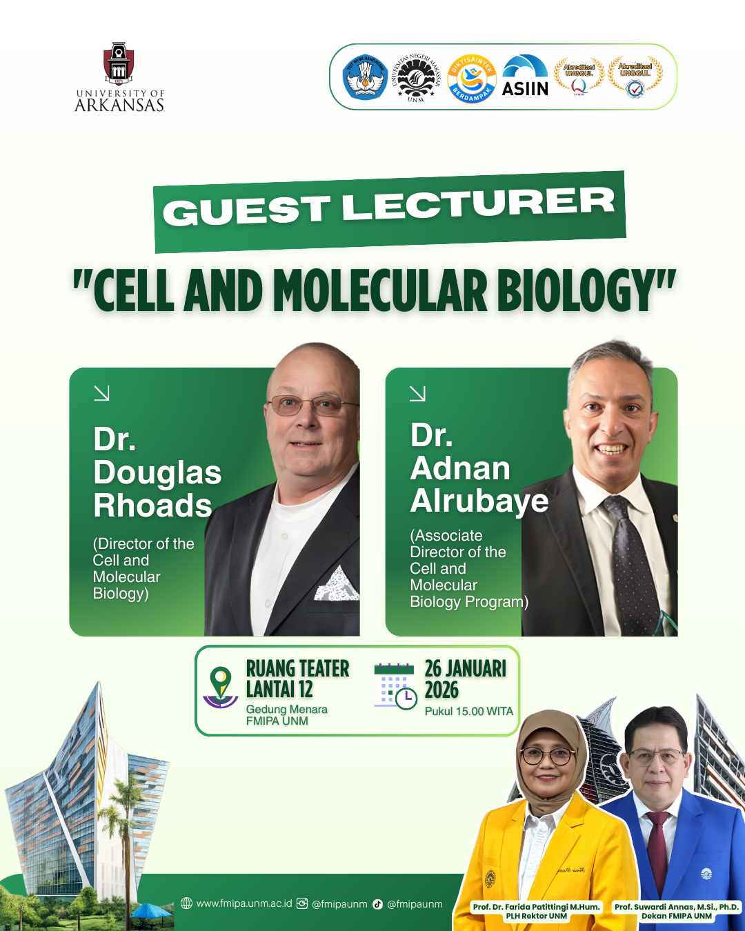 Makassar — Fakultas Matematika dan Ilmu Pengetahuan Alam (FMIPA) Universitas Negeri Makassar (UNM) menyelenggarakan kegiatan Guest Lecturer bertema “Cell and Molecular Biology” yang menghadirkan Dr. Doglas Rhoads, Director of the Cell and Molecular Biology Program, serta Dr. Andnan Alrubaye, Associate Director of the Cell and Molecular Biology Program dari University of Arkansas. Kegiatan ini berlangsung...Read More